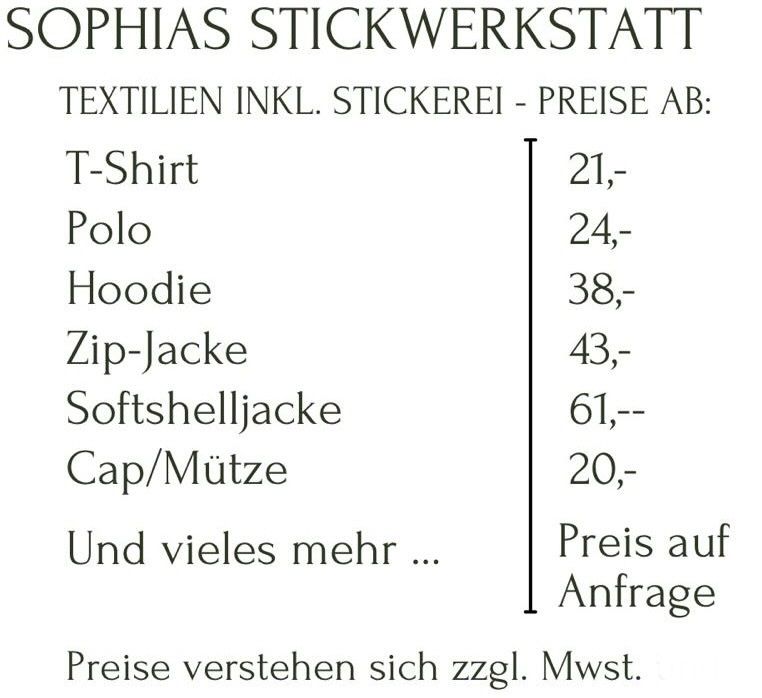 Der Preis beinhaltet das erstellen der Stickdatei und eine Stickerei bis zu ca. 10 cm breite (Stickkosten werden aus der Anzahl der Stiche berechnet). Der Preis der Textile ist nicht inklusive.